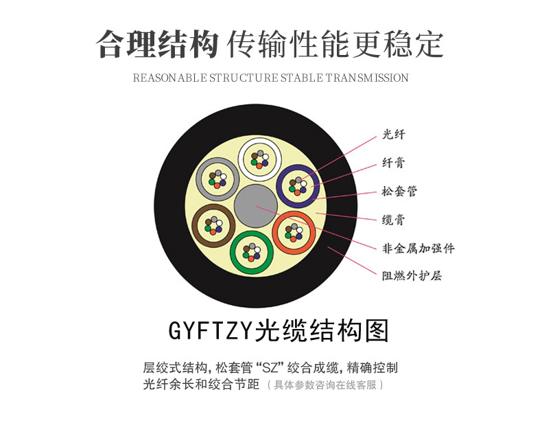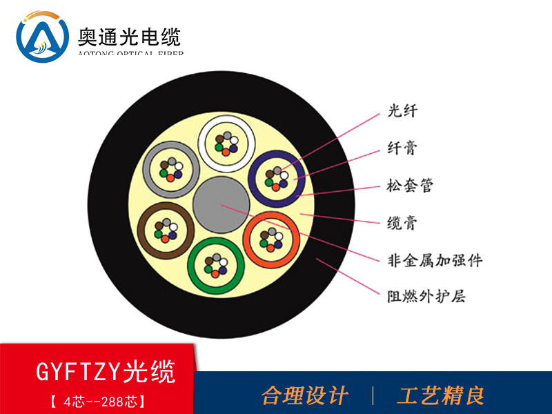 产品描述:GYFTZY光缆的结构是将250μm光纤套入高模量材料制成的松套管中,松套管内填充防水化合物。缆芯的中心是一根玻璃纤维增强塑料(FRP),松套管(和填充绳)围绕中心加强芯绞合成紧凑和圆形的缆芯,缆芯内的缝隙充以阻水填充物。缆芯外挤上一层阻燃护套成缆。良好的抗压性和柔软性;特种护套材料具有优异的阻燃性能;敷设方式:管道、架空